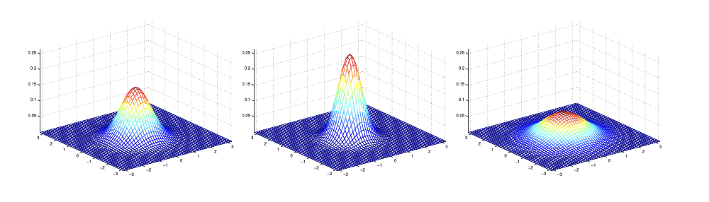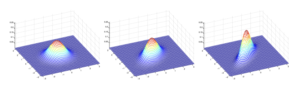 最左边的图显示了一个均值为零(即2x1零向量)和协方差矩阵 \(\Sigma = I\)(2x2单位矩阵)的高斯分布。具有零均值和单位协方差的高斯分布也称为标准正态分布。中间的图显示了一个均值为零和 \(\Sigma = 0.6I\) 的高斯分布的密度;右图显示了一个 \(\Sigma = 2I\) 的高斯分布。我们看到,随着 \(\Sigma\) 变大,高斯分布变得更"分散",而随着 \(\Sigma\) 变小,分布变得更"压缩"。