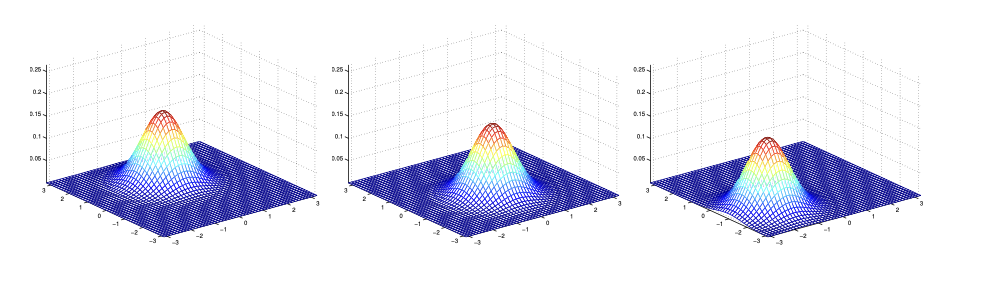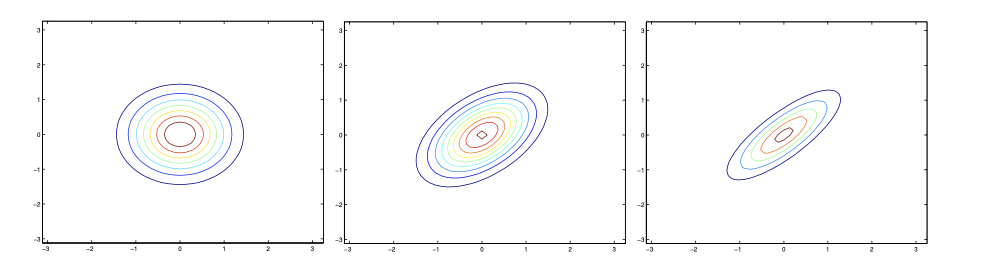 \[\Sigma = \begin{bmatrix} 1 & 0 \\ 0 & 1 \end{bmatrix}; \Sigma = \begin{bmatrix} 1 & 0.5 \\ 0.5 & 1 \end{bmatrix}; \Sigma = \begin{bmatrix} 1 & 0.8 \\ 0.8 & 1 \end{bmatrix}.\]