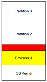 如图 Process 1 使用了 Partition 1,但其所需空间小于 Partition 1 的大小,因此会导致红色部分的内存没有被使用且不能被别的进程使用(因为每个 partition 只能被一个进程使用)。由于这是 partition 内部的不可用内存,我们称之为 Internal Fragmentation。