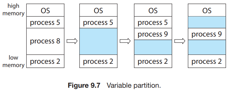 我们也可以考虑不固定 partition 的大小。在这种方案中,操作系统维护一个表,记录可用和已用的内存。最开始时整个内存就是一大块可用的内存块(将可用内存块称为 hole);经过一段时间的运行后,内存可能会包含一系列不同大小的孔。下图是一个示例。
