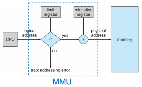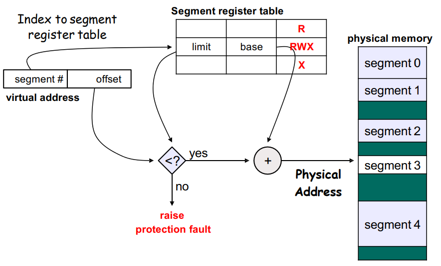 每当 context switch 到一个新的进程时,CPU 会 load 这两个寄存器的值。每当 user mode 想要进行一次内存访问时,CPU 都要检查其是否试图访问非法地址;如果是,则会引发一个 trap 并被当做致命错误处理(通常会 terminate 掉进程)。